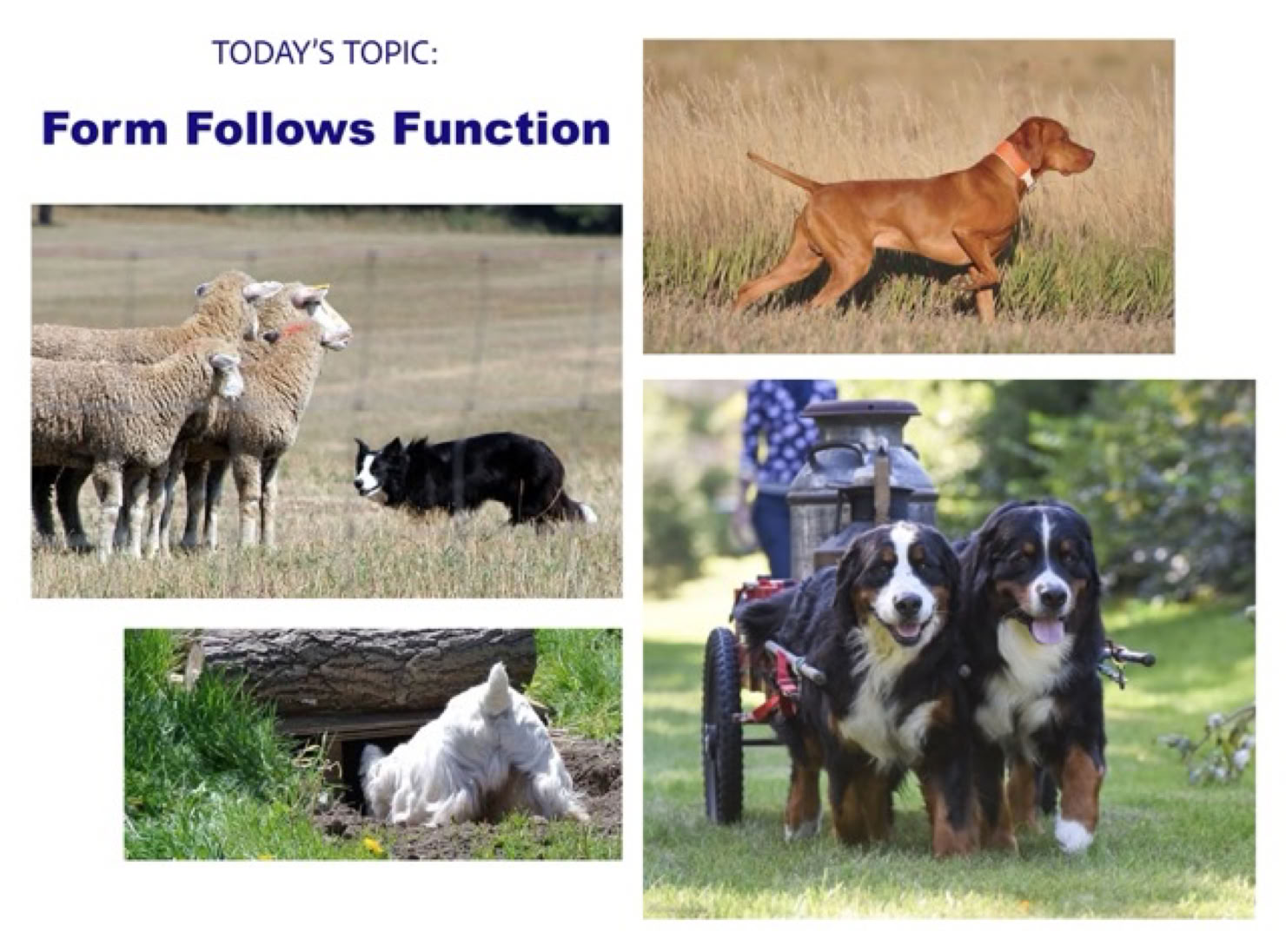 So, to be brief (too late for that), form follows function means that a dog should be built to enable it to perform what that breed is supposed to do. Toy breeds are basically designed to be lapdogs, so we certainly don’t expect them to move with the same drive and reach that we would expect from a Herding breed, whose function requires it to be very agile, quick, and move with alacrity to keep the cattle or sheep or whatever moving in the direction that the shepherd desires.